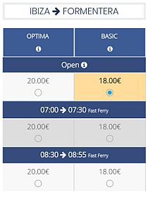 Nous vous conseillons de sélectionner l’horaire OPEN. De cette façon, vous n’aurez pas à choisir l’heure à l’avance. Vous pourrez monter sur n’importe quel bateau de Formentera Lines et de Trasmapi sans faire la queue à la billetterie (vous devrez faire le check-in en ligne avant le départ, comme pour les vols aériens).